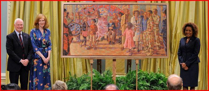 Taken at the unveiling of the public display of 'The Official Painting of Governor General, Michaelle Jean (right). Governor General David Lloyd Johnston (far left) standing beside him is its creating artist, Karen Bailey. The painting has found a place of honour in Rideau Hall.