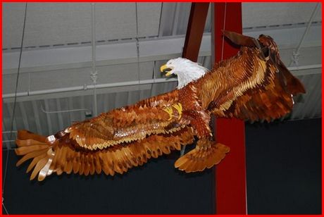 A three-metre-wide carved wooden eagle by artist Wes Seeley hangs from the ceiling of the Comox Valley Airport terminal building in this undated handout photo. Part of a new display of artworks intended to create a positive first impression for visitors arriving on Vancouver Island, the works by 10 artists represent ???the unique people, places and environment??? of central and northern Vancouver Island, say organizers of the exhibition which will run until July 2013. THE CANADIAN PRESS/HO